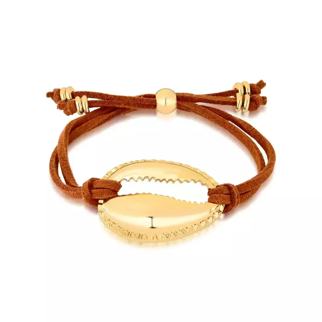 Pulseira ajustável de corino marrom com pingente búzio.